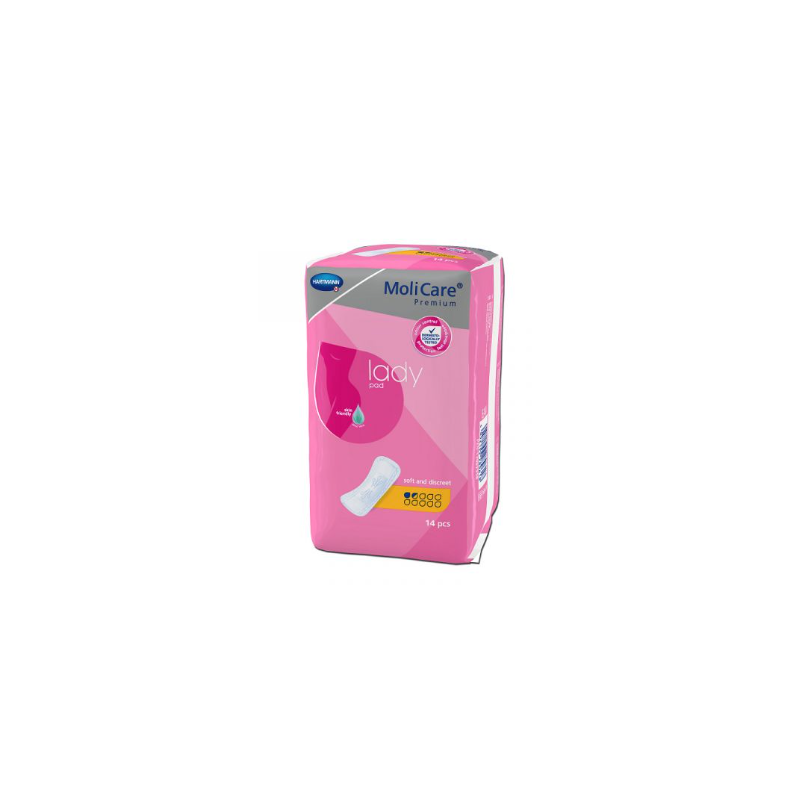 Pensos absorventes femininos, anatomicamente moldados, para perdas de urina com uma absorção de 1,5 gotas. Embalagem com 14 unidades.
