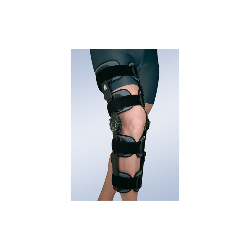 - Fabricada com 4 bandas acolchoadas, faixas de velcro de ajuste e duas articulações monocêntricas com regulação de bloqueio de -10º a +30º e com controlo de flexão de 0º a +120º em intervalos de 10º;