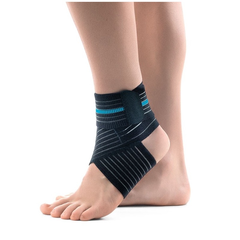 Pé elástico com banda cruzada de ajuste em velcro para uma adaptação perfeita.