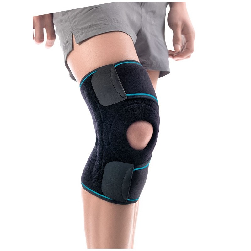 Joelheira ACTIUS em neopreno com rótula aberta de tamanho universal e com estabilizadores laterais.