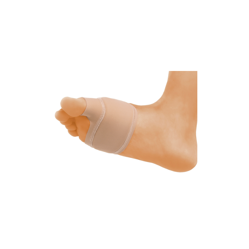 Protetor de hallux-valgus com almofada metatársica em gel forrado com tecido.