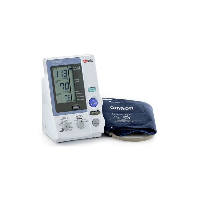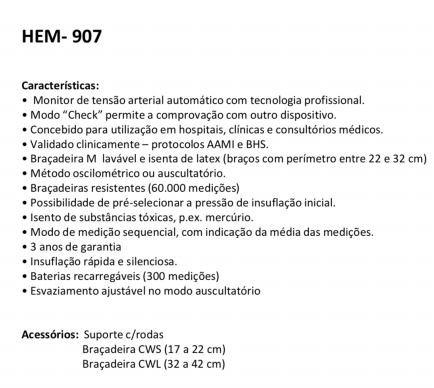 O HEM-907 é um medidor de pressão arterial digital de braço para uso profissional, com possibilidade de programação de 2 ou 3 medições consecutivas, modo manual para toma por auscultação, modo check para comprovar a calibração e pré seletor da pressão insuflada. Com bateria recarregável.