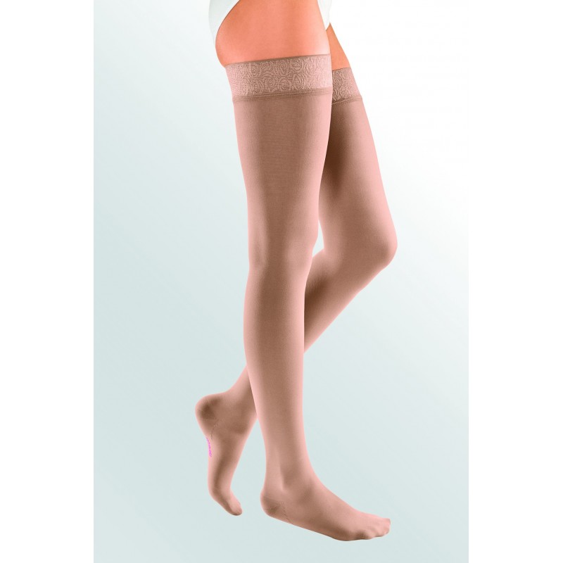 Mediven Elegance, em malha circular, é a meia de compressão adequada para maiores exigências. Tem a biqueira fechada, com efeito antibacteriano (estilo standard) e pé universal para todos os tamanhos. O modelo até à coxa (AG) com banda de fixação pode ser curto ou de altura normal. A compressão é classe 2 (23 a 32 mmHg).