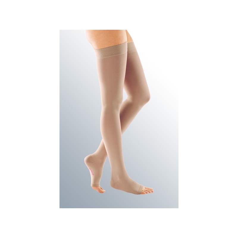 Mediven Plus, em malha circular, é a meia de compressão experimentada e testada para ela e para ele. É agradável para a pele, durável e opaca e tem a biqueira aberta para estilos standard.O modelo meia até à coxa (AG) com banda de fixação pode ser curto ou de altura normal. A compressão é classe 2 (23 a 32 mmHg).